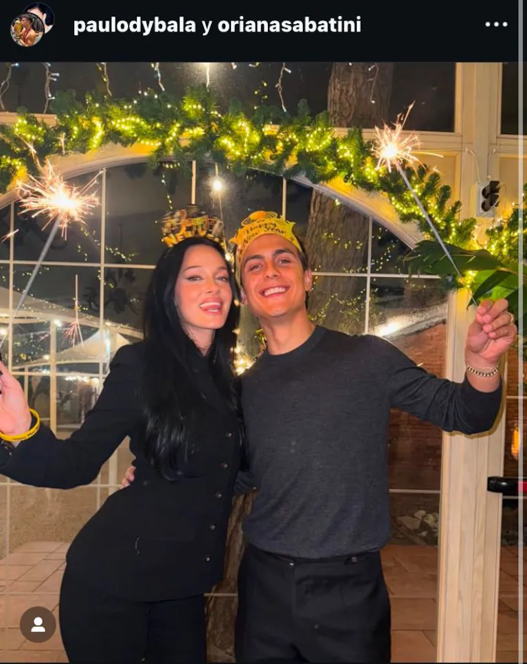 Una de las parejas que más sorprendió con sus atuendos para la Noche Vieja fue el matrimonio de Paulo Dybala y Oriana Sabattini. Contraria a la tradición que se viene utilizando en los últimos años, ambos optaron por un look totalmente negro. Estaban los dos de pantalón, ella con camisa y el futbolista con un sweater gris.