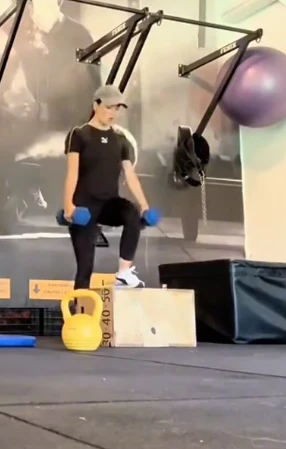 Por último, Lali vuelve a subir al cajón, pero esta vez, para sumar más dificultad, le agrega un par de mancuernas al ejercicio. Con ese mismo elemento realiza flexiones de brazos. Finalmente, cierra su rutina con una infaltable serie de abdominales.