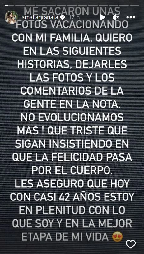 A continuación, subió algunos de los comentarios de los haters en la publicación de Facebook de dicho portal. "¿Qué le pasó a Amalia? Tiene el cuerpo de una señora y apenas tiene cuarenta. Qué lástima", puso una persona.