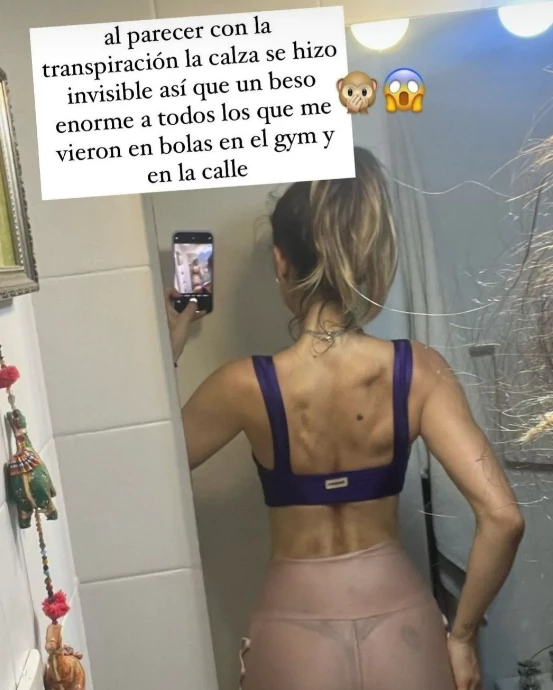 "Al parecer, con la transpiración, la calza se hizo invisible. Así que un beso enorme a todos los que me vieron en bolas en el gym y en la calle", compartió Jimena, quien tuvo que mantener el look hasta regresar a su casa porque no había llevado otra ropa para cambiarse.
