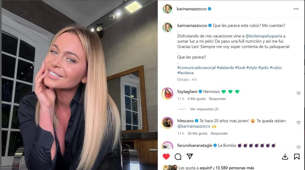 "Disfrutando de mis vacaciones viene a sumar luz a mi pelo. De paso, una full nutrición y así me fui... Gracias Leo, siempre me voy contenta de tu peluquería", destacó Mensaje, sobre su descripción. Y si Kari, quedaste más bella que nunca...
