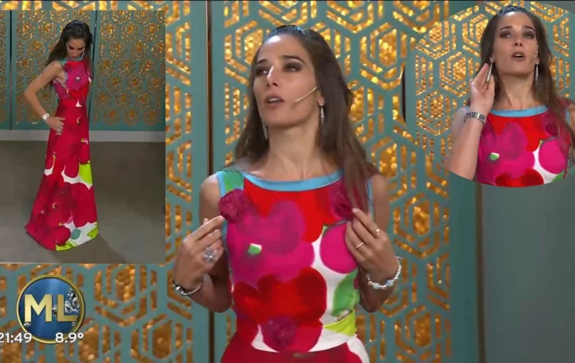 “Tengo un vestido que no es vestido. Es una falda con una remera, es de raso y yersey de algodón. Por supuesto… ¡del señor Bogani! También tiene aplicaciones de flores de rafia, que no sé si las pueden observar. Esto es para que venga un picaflor y me pique. Pura primavera. Todo del señor Bogani: con los bolsillos un poquito más abajo, que a mi me encantan, bien cancheros”, comentó la morocha Juana Viale.