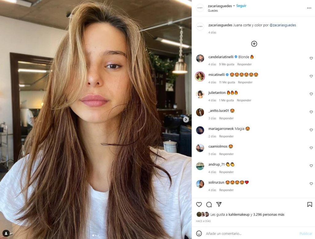 Juanita le dijo adiós a su melena morocha y sorprendió con su nuevo tono: un castaño claro en forma de balayage. Además, en la parte frontal se lo aclaró mucho más logando un rubio caramel y se cortó las puntas dañadas. Sin dudas, la jovencita quedó súper contenta con el nuevo color de su cabello y posó muy contenta.