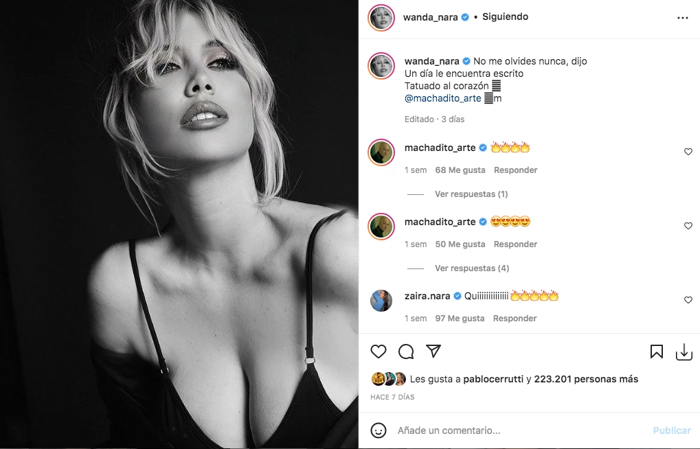 La mediática utilizó una frase sugerente para acompañar las fotos. “No me olvides nunca', dijo. Un día le encuentra escrito. Tatuado al corazón”, escribió Wanda al pie de las imágenes, sin mencionar a quién se encuentra dirigido.