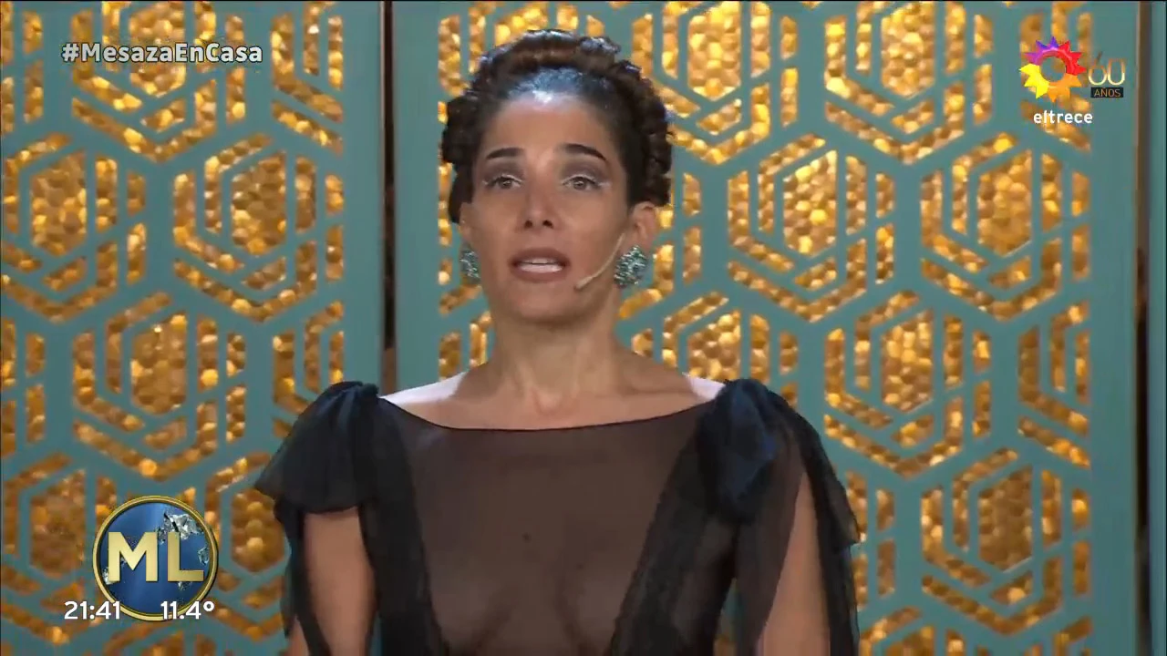 "Miren esta espectacularidad. ¡Voy a desfilar! ¡Qué lindo! ¡Buen sábado para todos! Miren este Bogani, maravilloso, que tengo. Voy a tener movimientos como el género, lentos", dijo la actriz, que este domingo espera a Adrián Suar en su mesa. El vestido fue realizado por Gino Bogani, uno de los preferidos de su abuela.