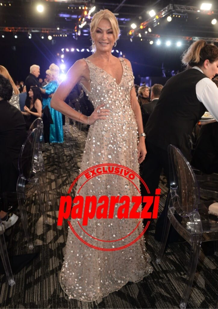 Yanina Latorre eligió nude con paillettes circulares, escote en “V” y recogido alto: brillo a full. Flor de la V apostó al corset con transparencias y un estolón de plumas gris que coronó un look súper teatral. Pamela David fue por el negro absoluto de tul en capas, strapless corazón y collar fino: elegante y poderosa.