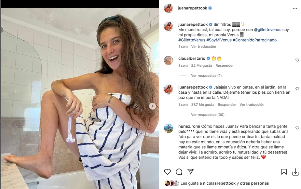 Juana Repetto hizo una publicidad en sus redes sociales y la "mataron" por su apariencia estética. la influencer promocionó una maquinita de depilar mostrándose en el baño de su basa, vestida con una toalla y con una de sus piernas elevadas sobre un "vanitory". Y la criticaron porque el talón de su pie se ve sucio.