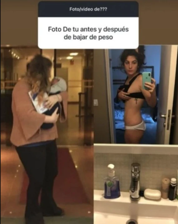 “Esta foto del antes es cuando recién salía de parir. Nunca tuve ese sobrepeso sin estar embarazada, pero de una foto a otra hay 43 kilos de diferencia. Lo he mostrado, pero siempre el público se renueva”, comentó en una historia de Instagram.