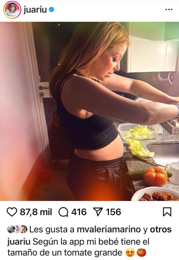 Ser madre es un antes y un después en la vida de cualquier mujer. Más aún en el caso del primer hijo. En ese proceso está Juariu, quien no deja de compartir en sus redes sociales diferentes postales del niño que viene en camino. En la última, con muy buen humor, publicó una foto cocinando y aseguró que según una app, su bebé actualmente tiene el tamaño de un tomate grande.