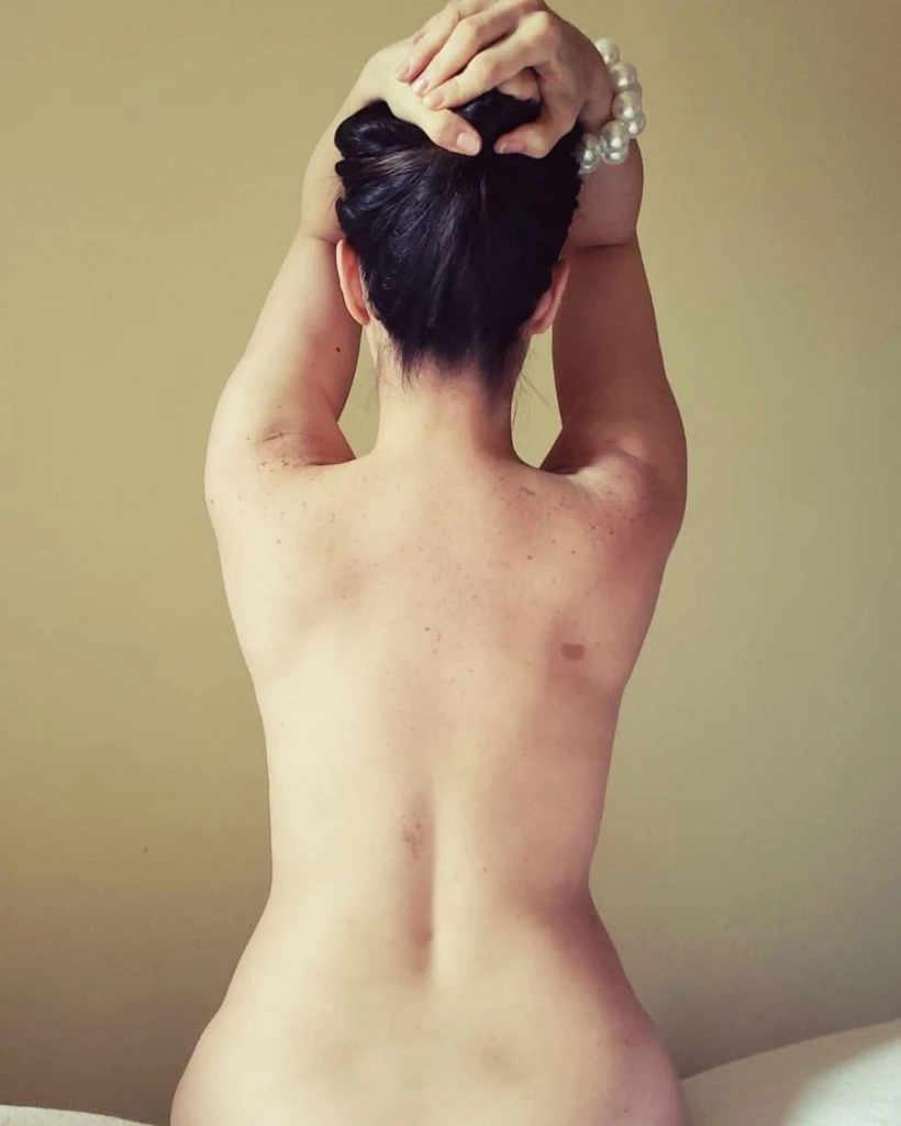 Hace pocos días, la actriz había mostrado la sugerente imagen pero recortada y en blanco y negro. Ahora, se animó a todo y lució su cuerpo desnudo con un retrato de espaldas y sosteniéndose el rodete del pelo con ambas manos.