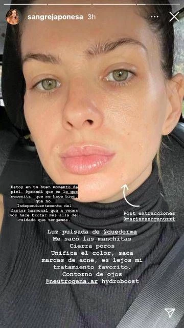 Dentro de los cuidados estéticos que realiza, dijo conforme que la luz pulsada es su tratamiento preferido por distintos motivos: "Me sacó las manchitas, cierra poros, unifica el color, saca marcas de acné, es lejos mi tratamiento favorito", y hablando de temas hormonales concientizó a sus seguidoras sobre la importancia de aceptar los distintos ciclos del cuerpo: "El factor hormonal que a veces nos hace brotar más allá del cuidado que tengamos".