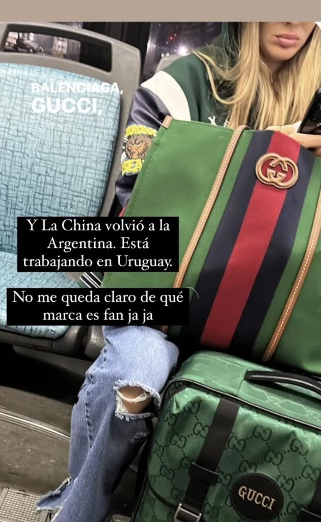 Tal como se ve en la imagen la China, fiel a su clásico gusto por el verde, uso un carry on y un bolso de mano en ese tono de la marca Gucci. Es que a la actriz desde hace un tiempo a esta parte se la viene viendo lucir incluso prendas y accesorios de este diseñador internacional.