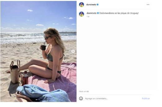 Dominique jugó con los dichos del jefe de gabinete y realizó una humorada, dado que mixturó su descanso con la frase del político que se volvió viral. De ese modo, Metzger acompañó su postal con una redacción graciosa: "Deslomándome en las playas de Uruguay".