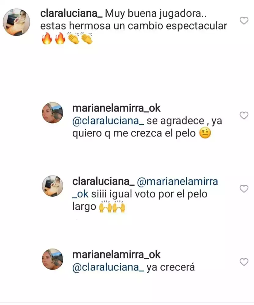 “Muy buena, jugadora… estás hermosa, un cambio espectacular”, fue el halago que alguien le dejó en su foto. A lo que ella, sincera, respondió: “Se agradece, ya quiero que me crezca el pelo". Y cuando alguien comentó que le gustaba más el pelo largo, ella cerró con un resignado: "Ya crecerá…”.