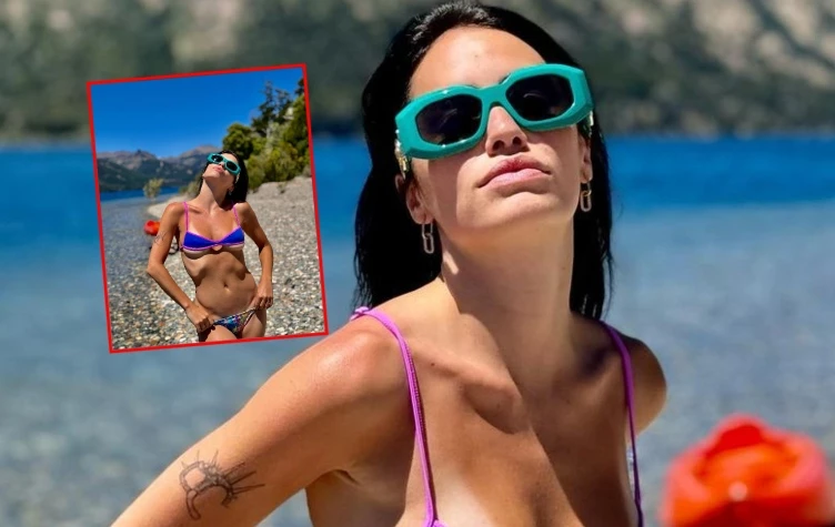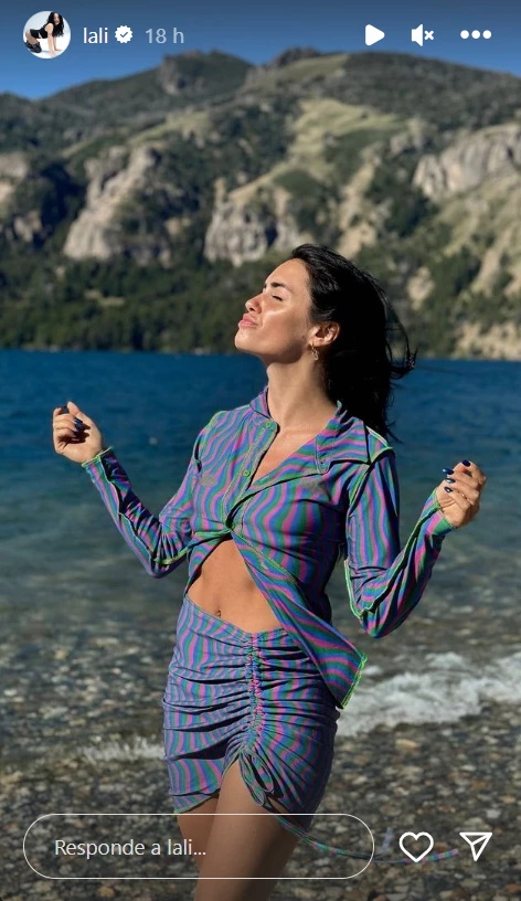 Pero la sorpresa llegaría luego, con un diminuto conjunto que causó sensación en redes, por la pequeña parte de arriba. Feliz con su outfit playero, Lali posó con el hermoso paisaje de fondo de aguas cristalinas y montañas.