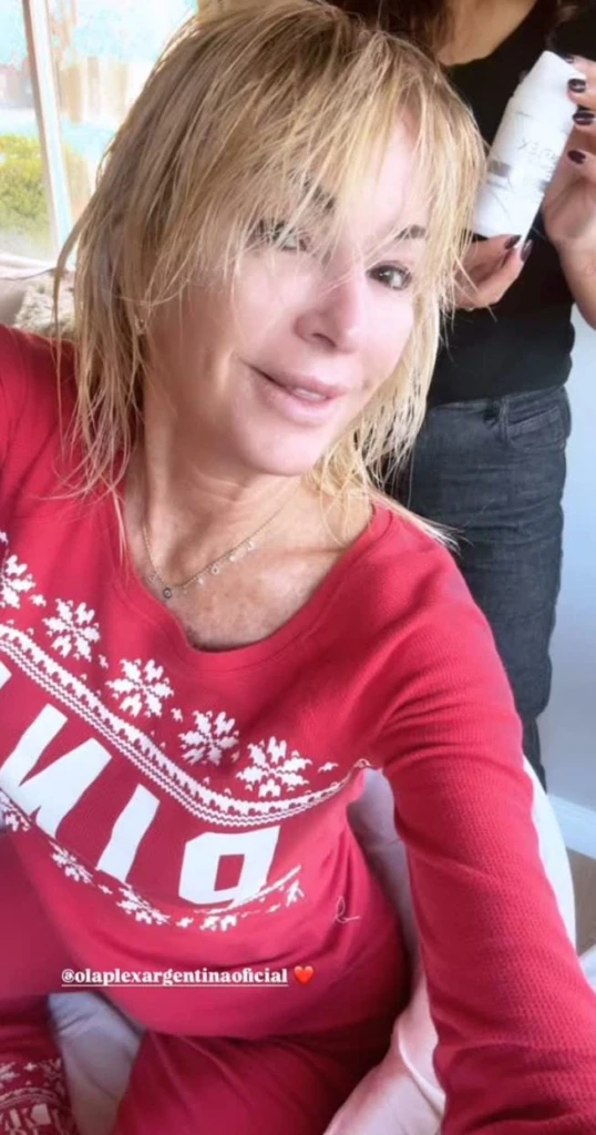 “Acá teñida. Esto lo usamos antes de peinarte. Gaby me pasa la pintura, pero el color lo hace el marido, no te hagas la canchera. Ella me hace todo pero la fórmula es de Robert”, explicó Latorre, quien recibió el servicio de peluquería en su casa.