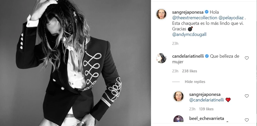 La fotos en blanco y negro muestran a la China luciendo una chaqueta de estilo militar con anteojos de sol negros y unas trenzas en el cabello. Las tres publicaciones superaron los 50 mil corazones y obtuvieron cientos de elogios.
