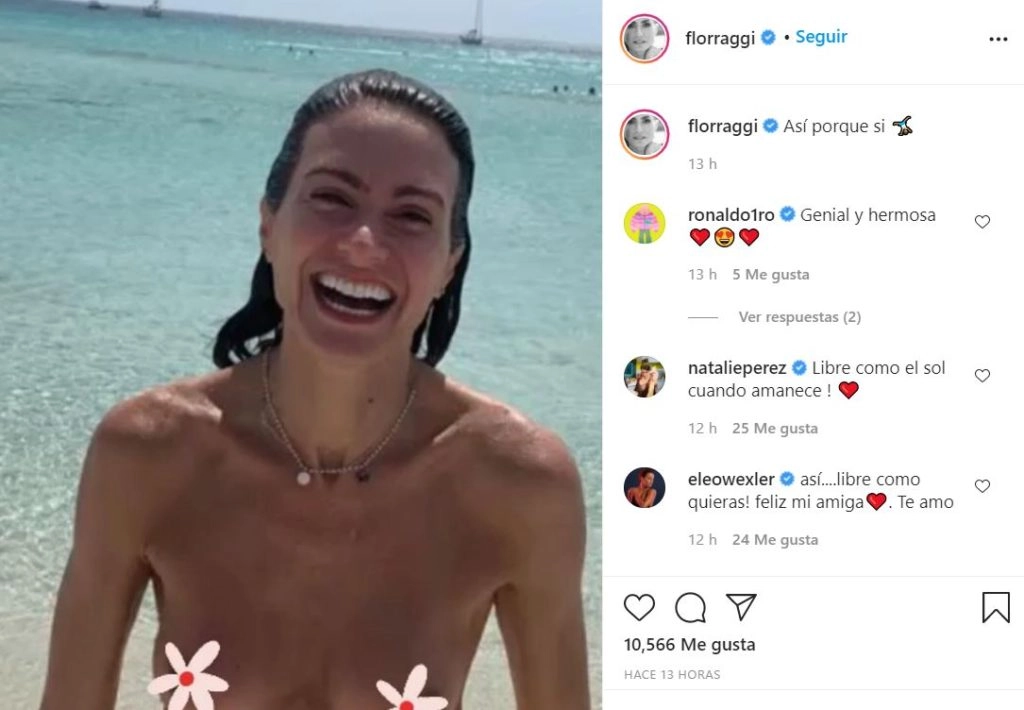 “Así porque sí”, expresó Raggi, pícara en su posteo que en pocas horas acumuló más de 10 mil likes y le valió comentarios de Eleonora Wexler, Natalie Pérez, Julieta Cardinali, Marina Glezer, Natalia Graziano y más figuras que aplaudieron su actitud.