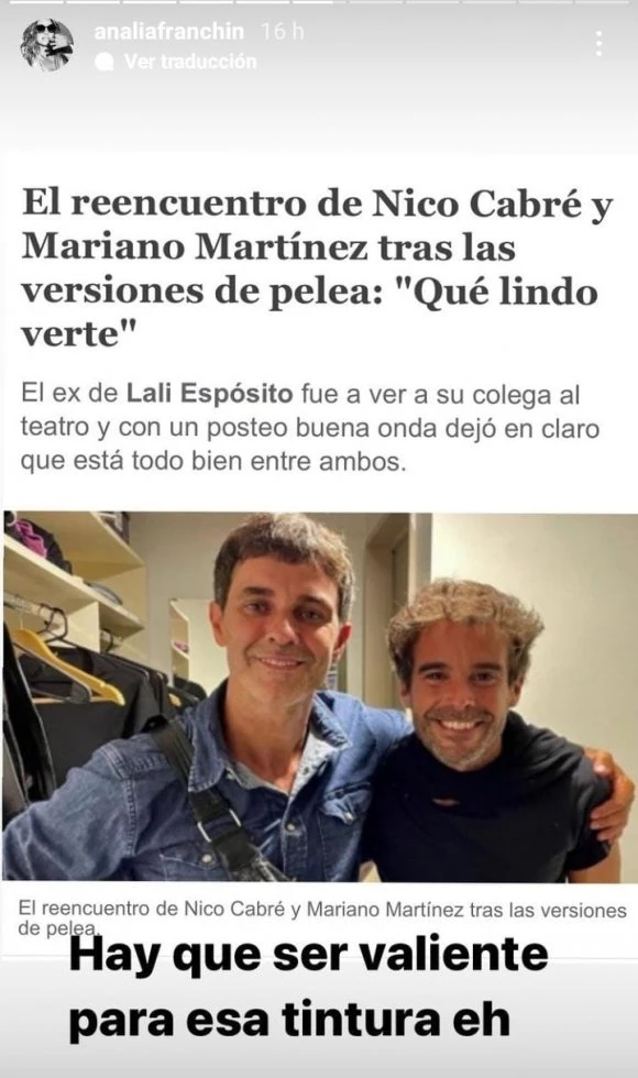 Pero, ¿qué fue lo que le llamó la atención a la Franchín? Nada de este bello meeting entre los actores sino el pelo de Cabré, que en la foto salió debajo de un foco de luz directa, muy poco favorecedora, produciendo un efecto extraño en su cabellera, por ahora, color castaño.