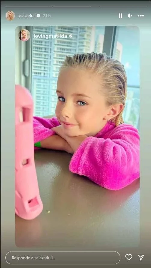 En las fotos compartidas por en historias, se vio a la pequeña jugando con su tablet, con el pelo peinado y mojado hacia atrás, con una salida de baño fucsia.