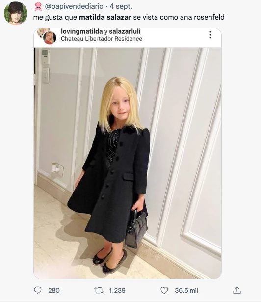 Lo que llamó la atención, a diferencia de otras veces, donde la mira está puesta en la madre y no en la hija, fue en que está vez el blanco de algunas críticas no fue Matilda, sino sus atuendos. Luciana posteó fotos donde su hija estaba vestida con ropa oscura y podría decirse grande, y una porción de la gente no dejó pasar la oportunidad de soltar sus pensamientos.