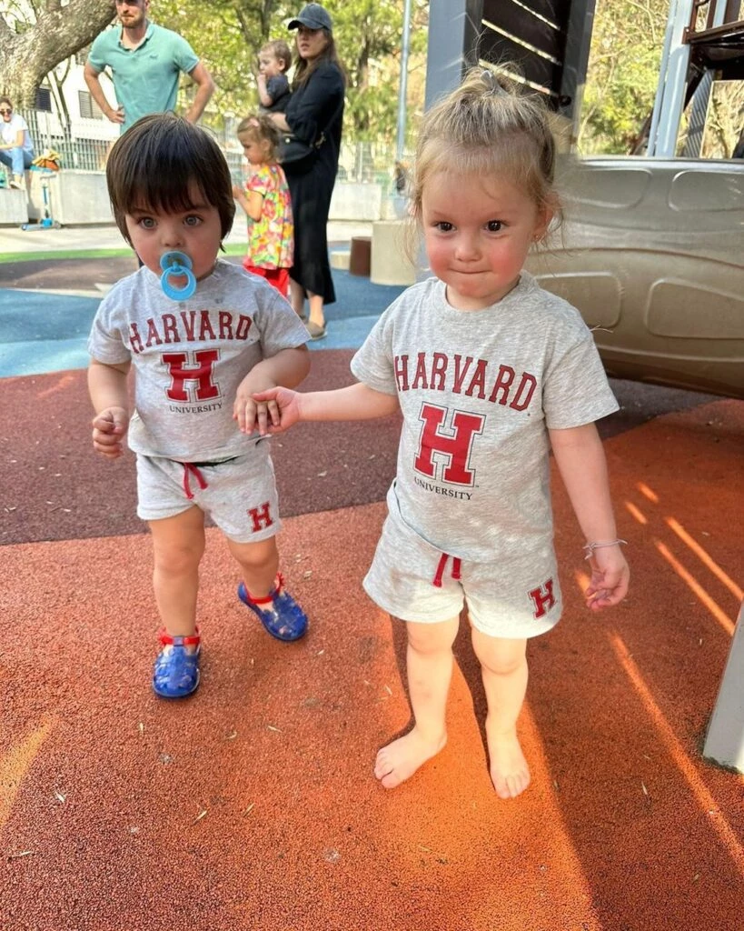Sí, como se dice en esta era moderna, Anita y Cósimo matchearon en el look ya que ambos lucían un conjunto gris de short y remera con la estampa de Harvard en color rojo, que tiene que ver con la reconocida universidad estadounidense.