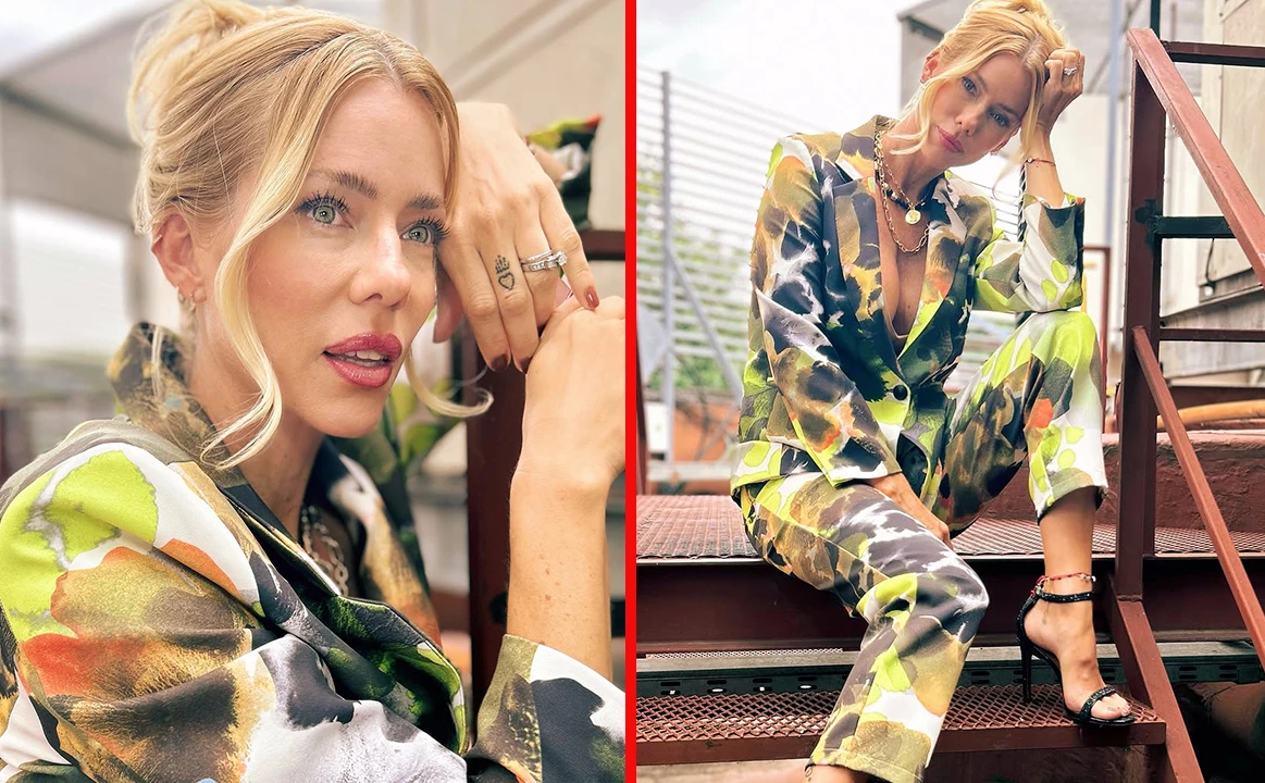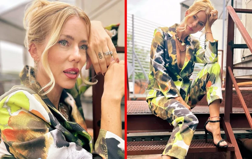 Para estar a la altura de su evento, Nicole Neumann eligió un look muy particular, ya que eligió inspirarse en la naturaleza. Es por eso lució un conjunto formado por un chaleco abotonado con un estampado floral que seguía el mismo que su falda, la cual mostraba un tono verde azulado con el mismo diseño.