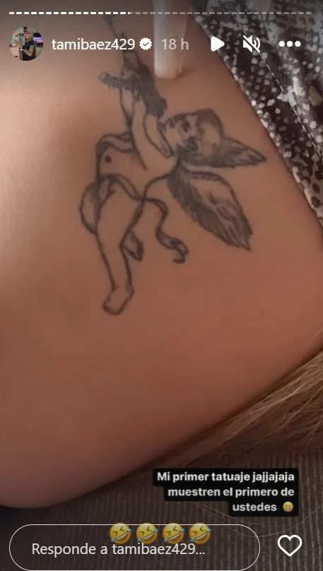 “Mi primer tatuaje. Muestren el primero de ustedes”, escribió la ex de L-Gante en sus historias de Instagram, muerta de risa, al lucir aquel dibujo con el que debutó con las agujas a una tierna edad: un cupido con alas que en vez de llevar arco y flecha, porta un arma.