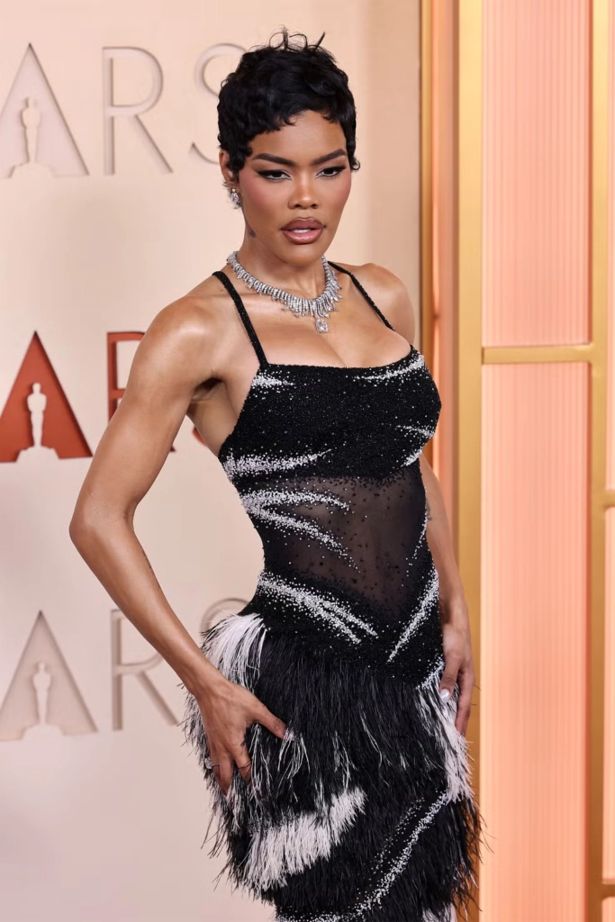 El dramatismo también estuvo presente en el estilismo de Teyana Taylor, quien eligió un vestido negro con transparencias, bordados brillantes y plumas en la falda. La artista completó el look con un collar de diamantes y un corte de pelo corto que reforzó su estética sofisticada.
