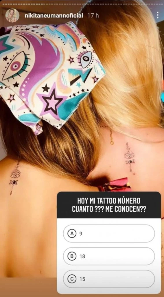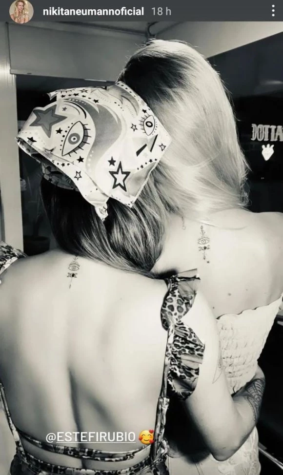 ¿Qué hizo Nicky? Se tatuó el idéntico dibujo con su íntima Estefanía Rubio: un diseño pequeño en tinta negra en la parte alta de la espalda, de estilo minimalista, que representa un ojo bien abierto y el ciclo de las distintas fases de la Luna, acompañado de líneas finas.