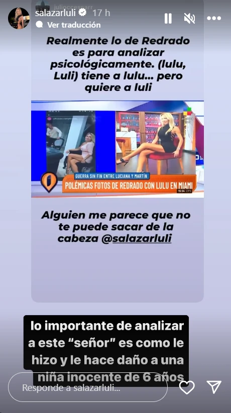 “Lo tóxico que es Redrado, hasta hace que la novia use el mismo vestido que Luciana Salazar”, destacaba la publicación que Luli compartió en sus historias. “Hasta imita el gesto de la mano que hace Luli. Y no es la primera vez que Redrado lo hace. Los medios ya lo habían destacado”, agregaba.