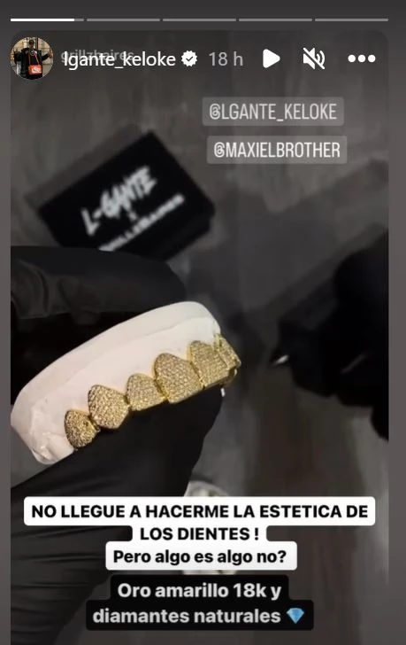 "No llegué a hacerme la estética en los dientes, pero algo es algo, ¿no? Oro amarillo de 18 kilates y diamantes naturales", escribió el cantante en sus historias de Instagram al presumir de los flamantes postizos que le hicieron especialmente a pedido.