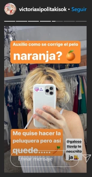 "Auxilio, ¿cómo se corrige el pelo naranja?", escribió Vicky junto a la foto en la que muestra el color que le quedó tras aplicarse sola el producto. Luego, fiel a su estilo divertido, la Griega confesó: "Me quise hacer la peluquera pero así quedé…".