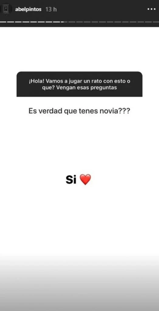 Tras el anuncio en algunos medios de su romance con Mora Calabrese, que logró verosimilitud gracias a la publicación de una serie de fotos juntos, Abel Pintos se sometió a un cuestionario de sus admiradores en Instagram y confirmó el romance.