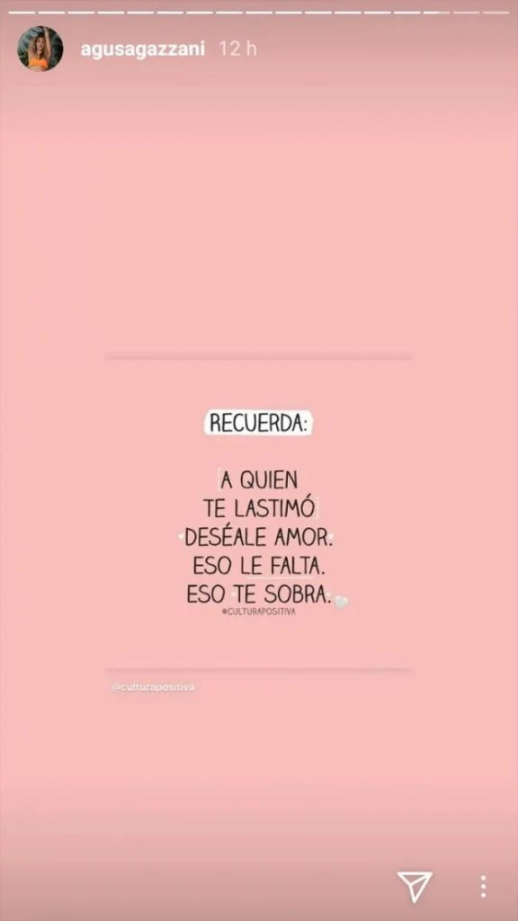 "A quien te lastimó deséale amor. Eso le falta, eso te sobra", decía el texto que Agustina publicó y aunque no explicitó que iba dirigido a Baclini, todos lo relacionaron con la reciente separación.