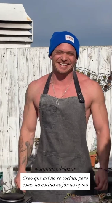 Hot, muy hot: Del Azar se mostró al aire libre sin remera, cubriendo sus pectorales con un delantal gris y un gorrito de lana azul para protegerse del frío. Divertido ante el pedido de su novia, el cocinero de El Hotel de los Famosos se animó a dar una vueltita y todo. ¿El comentario de los seguidores? Y sí: “Qué bien come Melody”.