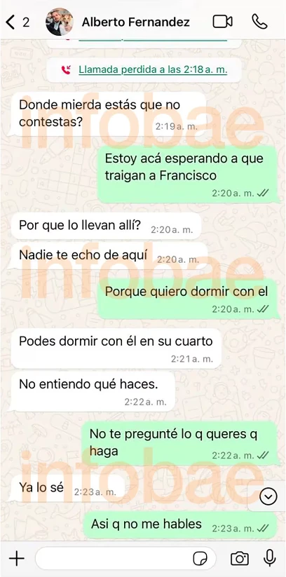 En el contenido de los chats se puede ver cómo es la conversación entre ambos, en horas de la madrugada. Fernández le pregunta a su esposa dónde está, ella le responde que está esperando que le lleven a Francisco, el hijo que tienen en común. Fabiola ya se había mudado a la casa de huéspedes, pero él busca convencerla de volver a la residencia principal. La secuencia, subiendo de nivel en intensidad, fue la siguiente: