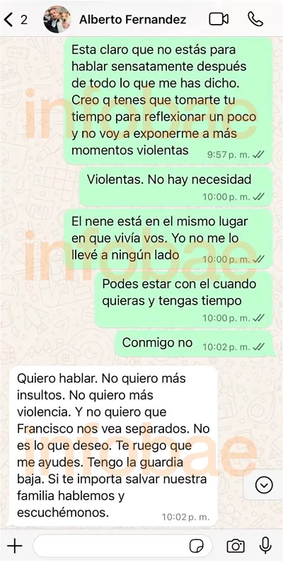 Dentro de los chats existe otra conversación que deja en evidencia la tensión existente. Ella le remarca que no quiere volverse a exponer a situaciones violentas, aunque él sigue buscándola persuadir, argumentando que deben hablar para salvar a la familia.