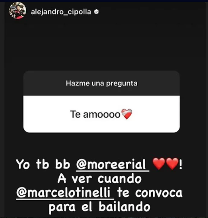 También, Cipolla lanzó un mensaje que deja en claro que su vínculo excede las cuestiones profesionales. “Yo también bebé, a ver cuando Marcelo Tinelli te convoca para el ‘Bailando’”, expuso. Y rápidamente, ella le respondió: “Te amo amor”.