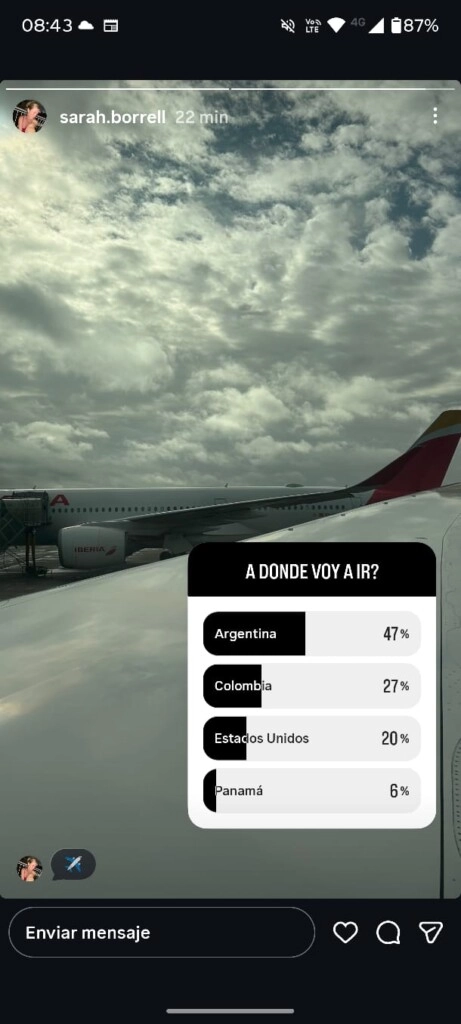 La amante de Luciano publicó una foto donde se ven los aviones de Iberia sobre la pista de lo que asumimos que es Barajas y una pícara pregunta en español para sus seguidores. “¿A dónde voy a ir?”. En primer lugar, puso “Argentina”. Luego, sumó un par de países más: Colombia, Estados Unidos y Panamá.