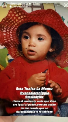 Resulta que Melody compartió en su Instagram una foto de su niña y agregó una descripción de su incipiente personalidad, de esos rasgos primarios que salen a flote. "Hasta el momento creía que Vene era igual al padre, pero me acabo de dar cuenta que no, Alex te re cabió".