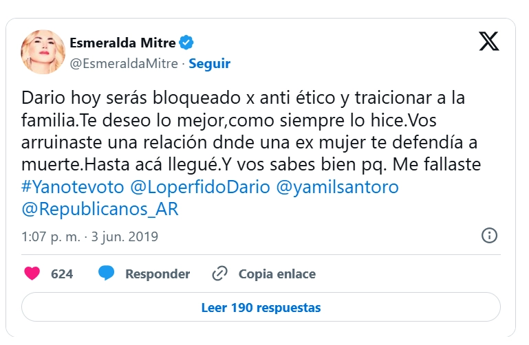 Porque si algo quedó claro es que la ruptura no fue pacífica en el largo plazo. En 2019, cuando ya estaban divorciados pero mantenían un vínculo cercano, Mitre lo bloqueó públicamente en Twitter y lo acusó de traición: “Darío hoy serás bloqueado x antiético y traicionar a la familia… Me fallaste”. Después redobló la apuesta: “Yo sufrí por sus traiciones porque yo no traicionó. Solo que no quiero que me jueguen sucio”. De la filosofía amorosa a los reproches sin anestesia.