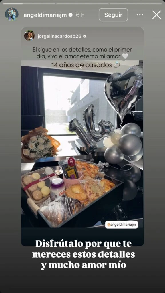 Jorgelina, mostró en sus historias una producción digna de película romántica. Empezó el día con un desayuno especial, un ramo de flores y globos gigantes con el número 14, acompañados de un corazón plateado. En una de las imágenes escribió: “El sigue en los detalles como el primer día. ¡Viva el amor eterno, mi amor! 14 años casados”.