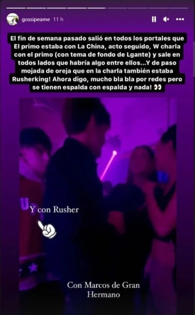 En la imagen que compartió Pochi de Gossipeame por historia, puede verse el tímido acercamiento entre la conductora de Masterchef y el ex de la China Suárez: "El fin de semana pasado salió en todos los portales que El primo estaba con La China, acto seguido, W charla con el primo (con tema de fondo de Lgante) y sale en todos lados que habría algo entre ellos… Y de paso mojada de oreja que en la charla también estaba Rusherking! Ahora digo, mucho bla bla por redes pero se tienen espalda con espalda y nada!".