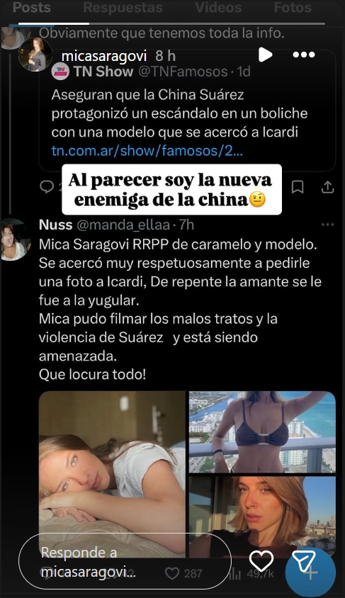 Pero, ¿quién era esa joven? En un principio se dijo que era del grupo de amigas de Juanita Tinelli. Y en las últimas horas, en X apareció un nombre, el de Mica Saragovi, RRPP de Caramelo y modelo. “Se acercó muy respetuosamente a pedirle una foto a Icardi, De repente, la China se le fue a la yugular. Mica pudo filmar los malos tratos y la violencia de Suárez y está siendo amenazada. ¡Qué locura todo!”.