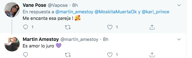 La respuesta de "Moskita" ("¡Te calmás!") generó una nueva declaración del periodista y productor televisivo. "¿Pero de qué lado estás? Una vez ayudame, hermano. No te pido nunca nada. Enamorado de Karina estoy!" le escribió Amestoy, quien no dejó pasar oportunidad para marcar sus intenciones.