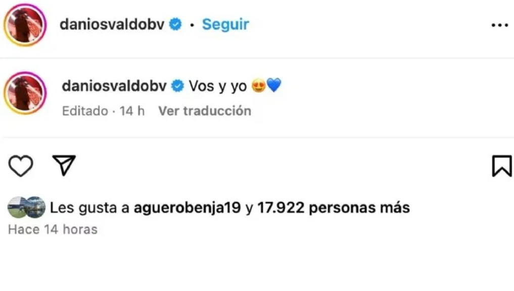 A través de un corazón, Benjamín dejó su “Me gusta” en la romántica publicación que Daniel Osvaldo tituló “Vos y yo”, todo un destape de parte del músico que no le debe haber caído bien a Gianinna, que hace días se mantiene en silencio.