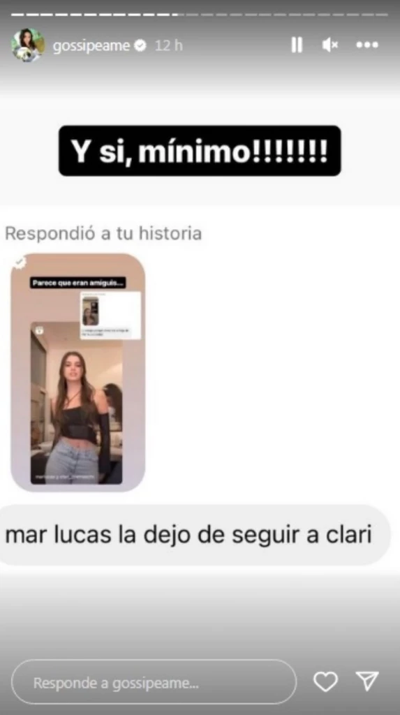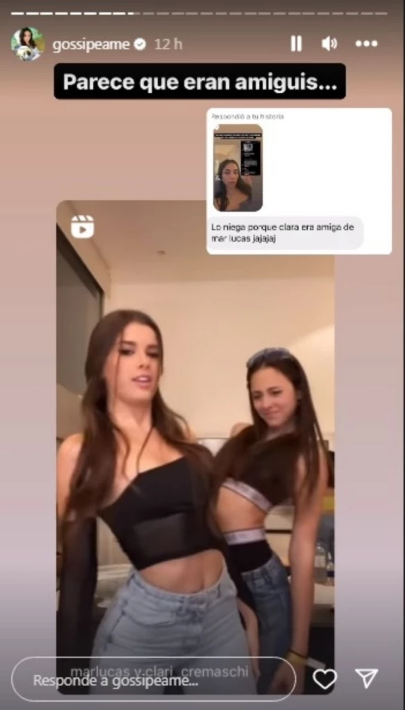 "Se anda diciendo que él anda con Clara pero él lo niega en su canal de difusión. Cremashi lo niega porque ellas eran amigas”, comentó Pochi, de la cuenta de Instagram Gossipeame, presentando fotos de ambos juntos en un boliche.