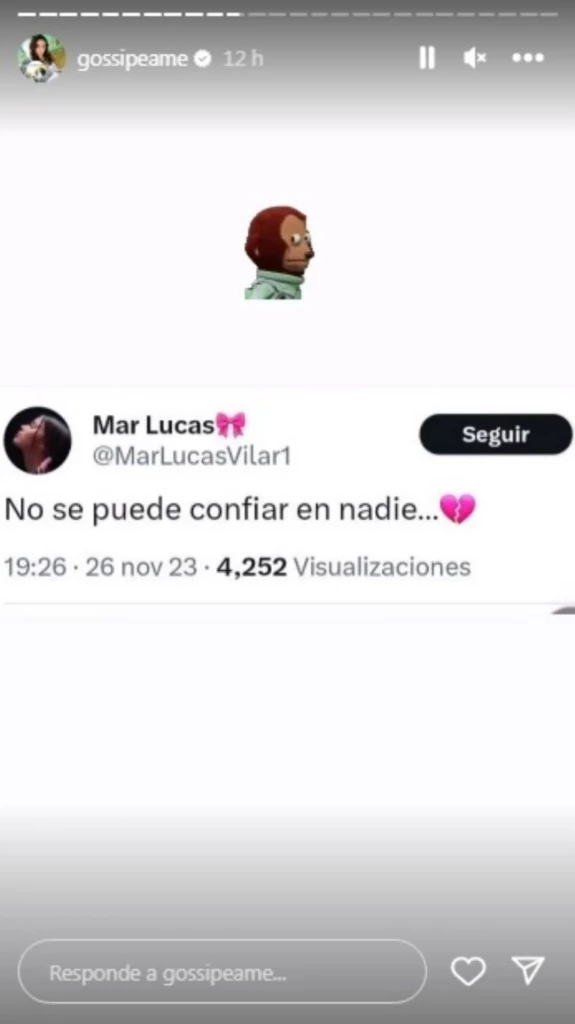 A partir de esto y que la información se viralizara en TikTok, Mar Lucas tuvo una contundente reacción que no hizo más que agudizar las sospechas. Mediante su perfil de X escribió una frase durísima que muchos seguidores lo tomaron como una dedicatoria al cantante y su amiga: "No se puede confiar en nadie".