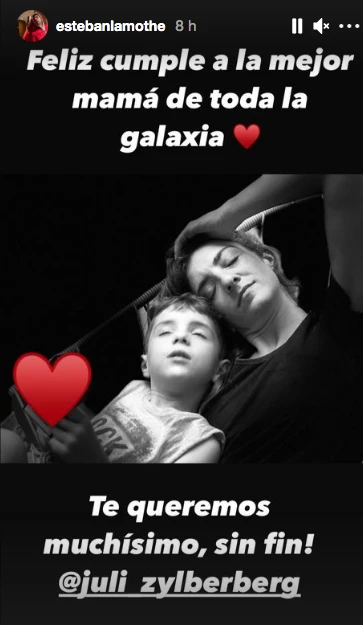 Pero ahora sorprendió un mensaje que Esteban -quien aseguró que saldría con Mirtha Legrand- le dedicó a Zylberberg en el día de su cumpleaños, acompañado de corazones, y que ella reposteó.“Feliz cumple a la mejor mamá de toda la galaxia. Te queremos muchísimo, sin fin”, dice el escrito que Lamothe acompañó con emojis de corazones.